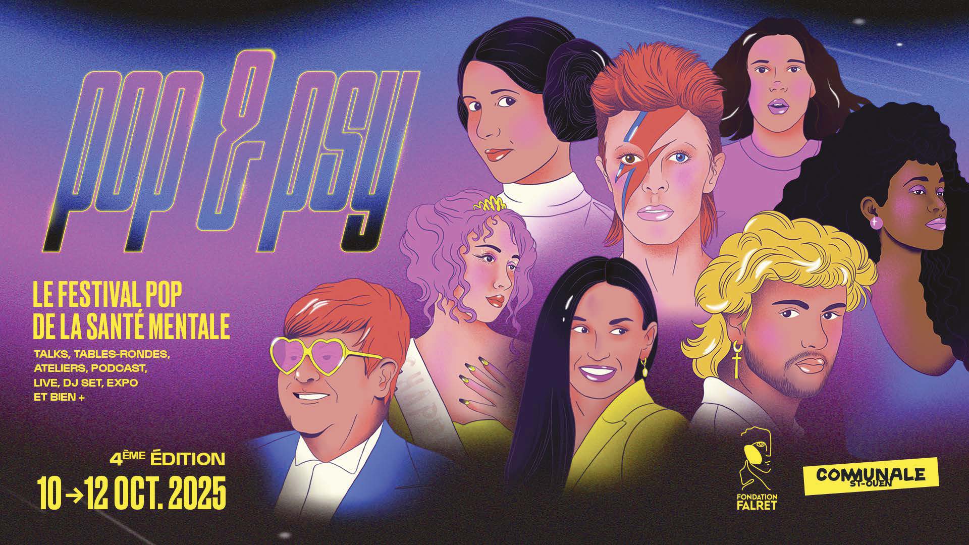 Le Festival Pop & Psy est un évènement culturel et scientifique gratuit à but non lucratif. Inclusif et engagé pour la santé mentale, il est porté par la Fondation Falret. Le festival Pop & Psy aura lieu à la Communale de Saint-Ouen, 9 Rue Frida Kahlo, 93400 Saint-Ouen-sur-Seine pour sa 4ème édition du 10 au 12 octobre 2025.